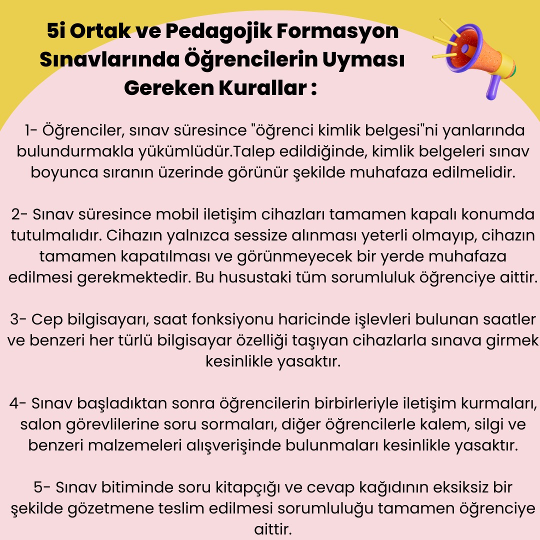 5i Ortak ve Pedagojik Formasyon Sınavlarında Öğrencilerin Uyması Gereken Kurallar
