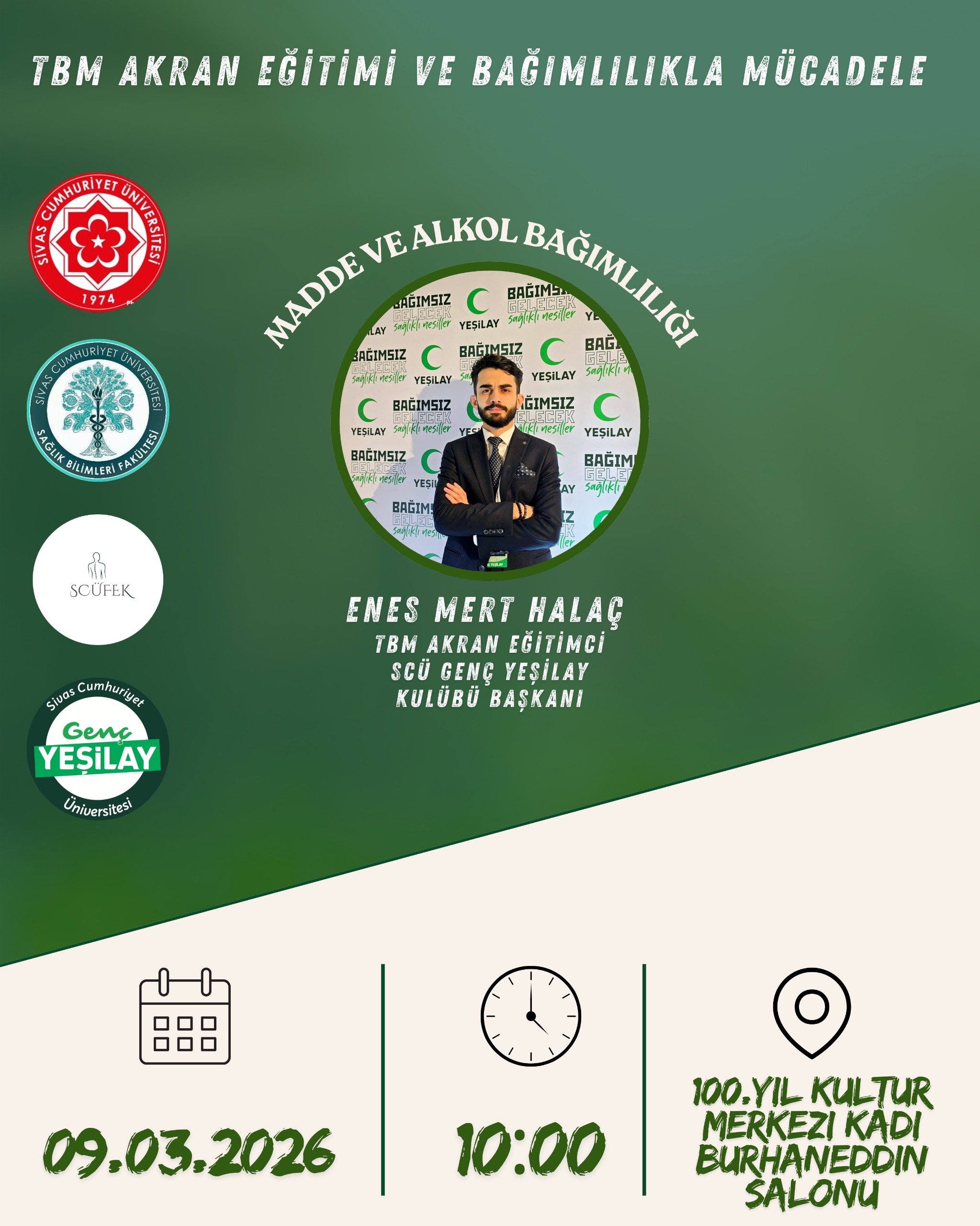 Sivas Cumhuriyet Üniversitesi Fizyoterapi Eğitim Kulübü (SCÜFEK) ve Genç Yeşilay Kulübü tarafından düzenlenen "TBM Akran Eğitimi ve Bağımlılıkla Mücadele" isimli seminer 9 Mart Pazartesi günü 100.Yıl Kültür Merkezi'nde yapılacaktır.