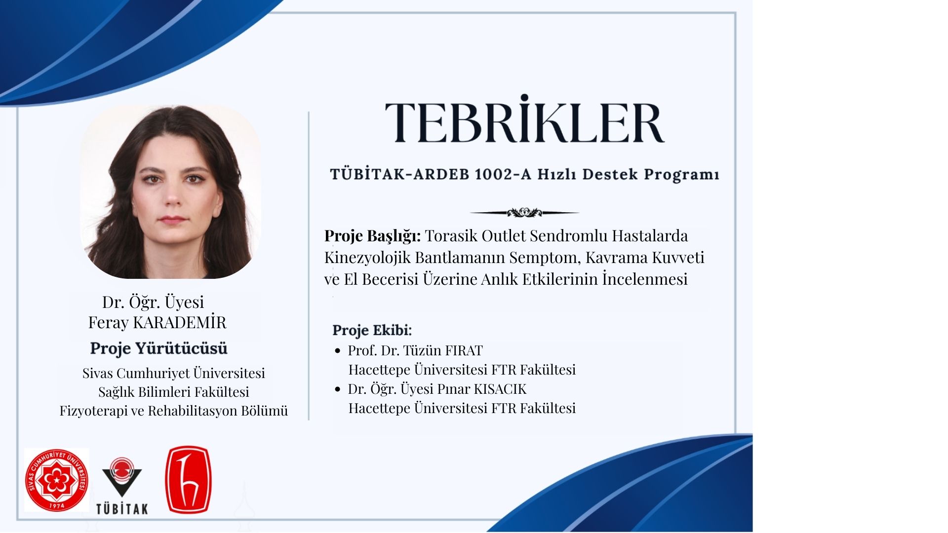 Bölümümüz öğretim üyelerinden Dr. Öğr. Üyesi Feray KARADEMİR’in yürütücülüğünü üstlendiği “Torasik Outlet Sendromlu Hastalarda Kinezyolojik Bantlamanın Semptom, Kavrama Kuvveti ve El Becerisi Üzerine Anlık Etkilerinin İncelenmesi” başlıklı proje, TÜBİTAK 1002-A Hızlı Destek Programı kapsamında destek almaya hak kazanmıştır. Hocamızı ve proje ekibini tebrik eder, çalışmalarında başarılar dileriz.