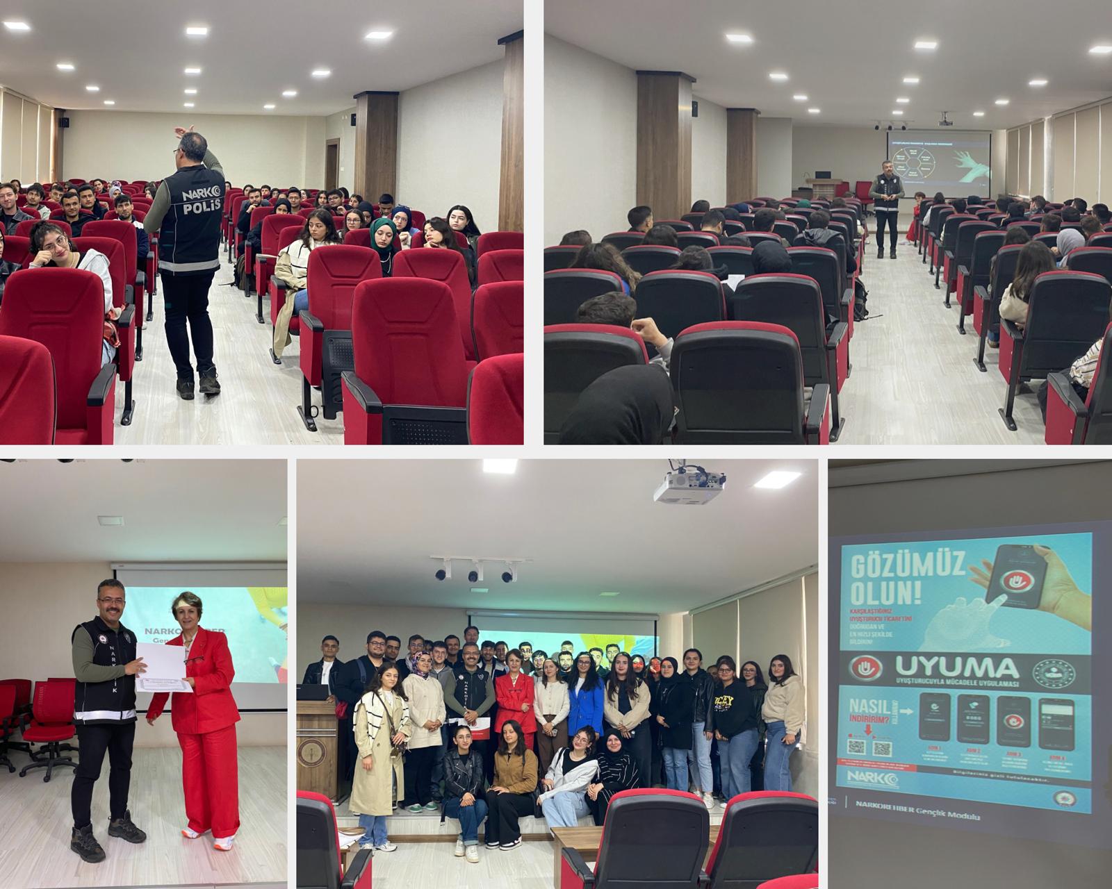 Sağlık Bilimleri Fakültesi Bağımlılıkla Mücadele Destek Programı kapsamında gerçekleştirilen etkinlikte, Narkotik Suçlarla Mücadele Şube Müdürlüğü’nden görevli polis memuru Ali BERTAN öğrencilere madde bağımlılığı, risk faktörleri, madde bağımlılığı belirtileri ve korunma yolları hakkında bilgilendirme sunumu yaptı.