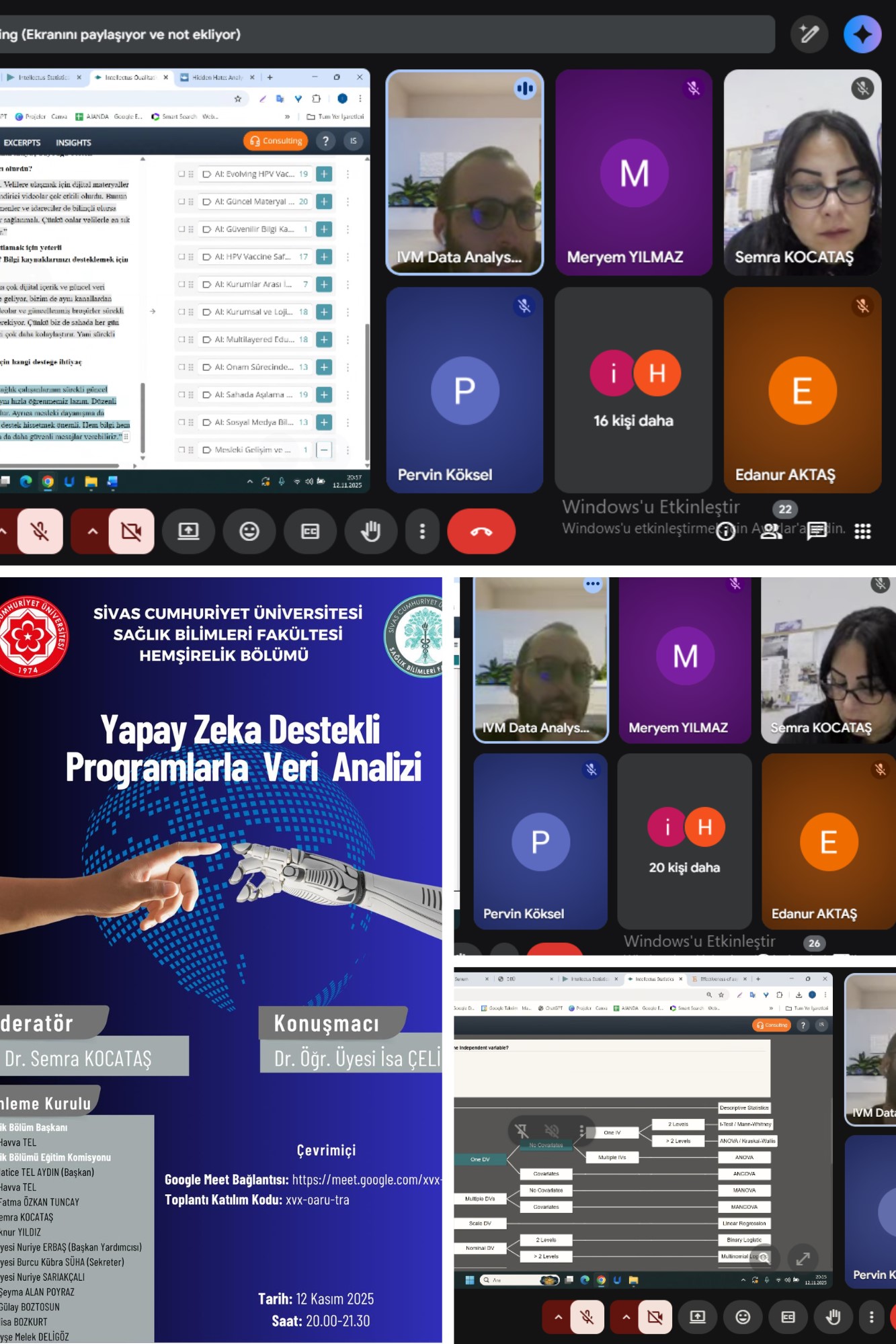 Sivas Cumhuriyet Üniversitesi Sağlık Bilimleri Fakültesi Hemşirelik Bölümü Eğitim Komisyonu tarafından 12 Kasım 2025 tarihinde “Yapay Zeka Destekli Programlarla Veri Analizi” konulu çevrim içi eğitim programı gerçekleştirilmiştir.
