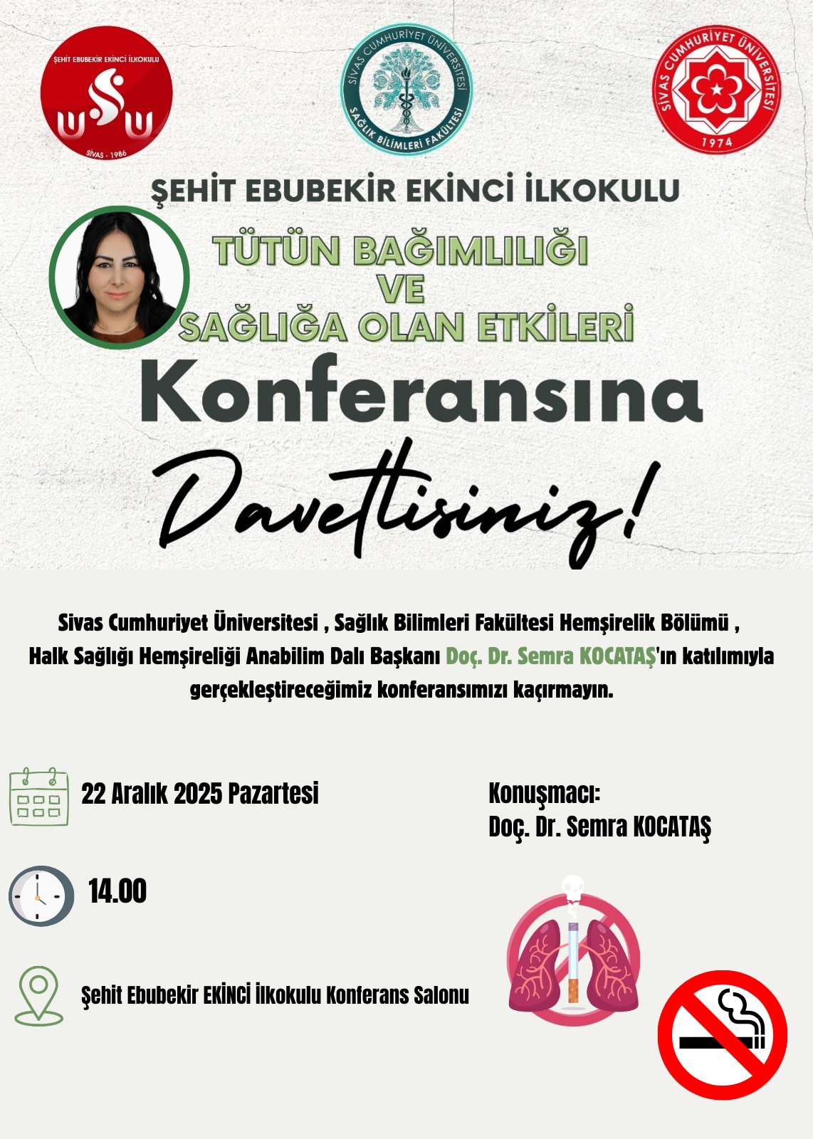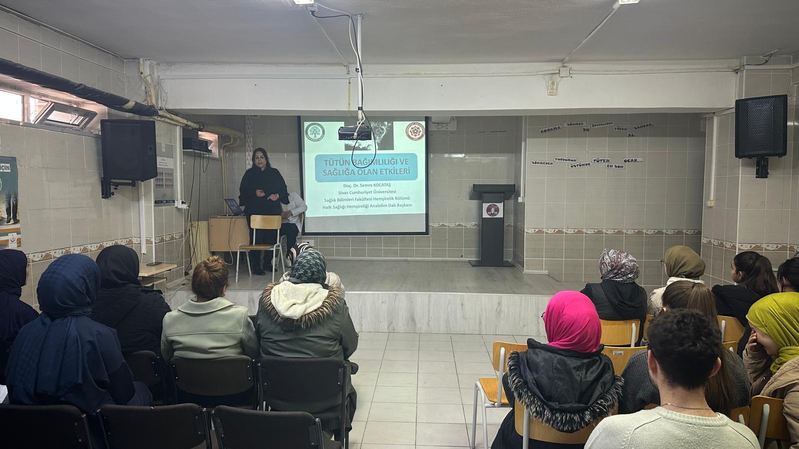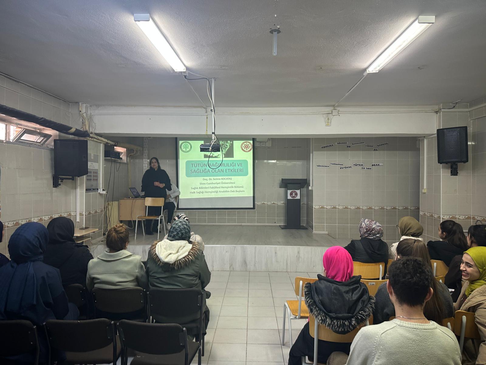Sivas Cumhuriyet Üniversitesi Sağlık Bilimleri Fakültesi Hemşirelik Bölümü Halk Sağlığı Hemşireliği Anabilim Dalı mesleki ana dersinin saha uygulamasında ilkokul ve ortaokullarda okul toplumunun sağlığını koruyucu-geliştirici etkinliklerde bulunan hemşirelik bölümü son sınıf öğrencileri tarafından öğrenci velilerinde sağlıkla ilgili konularda farkındalık geliştirmek ve bilinç kazandırmak amacıyla bir dizi etkinlikler gerçekleştirildi. Halk Sağlığı Hemşireliği dersinin saha uygulamasında yer alan hemşirelik bölümü son sınıf öğrencileri tarafından uygulamada bulundukları süre içerisinde Milli Eğitim Müdürlüğüne bağlı ilk ve orta dereceli okullarda öğrenim gören öğrencilere, okulda görev yapan öğretmenlere ve öğrencilerin velilerine yönelik çeşitli konularda sağlık eğitimleri ve sağlık taramaları yapıldı. Uygulama kapsamında yer alan okullardan biri olan “Şehit Ebubekir Ekinci İlkokulunda” 22 Aralık 2025 tarihinde Pazartesi günü saat 14.00’te Halk Sağlığı Hemşireliği Anabilim Dalı Başkanı Doç. Dr. Semra Kocataş tarafından öğrenci velilerine yönelik “Tütün Bağımlılığı ve Sağlığa Olan Etkileri” konulu eğitim verildi. Eğitimde hem aktif hem de pasif içiciliğin zararlarına ilişkin vurgulamalar yapıldı. Özellikle kapalı alanlarda tütün ürünleri kullanımının yasaklanmasına ilişkin yasa kapsamı dışında kalan ev ortamında sigara içenler nedeniyle ikinci ve üçüncü el sigara dumanı mazuriyetinin önemli bir halk sağlığı sorunu olmaya devam ettiği ve bu durumu önlemek için evlerde sigara içilmesinin önlenmesi, sigara içmeyen yetişkinlerin hem kendi hem de bebek ve çocuklarının “Temiz Hava Haklarını” savunmaları gerektiğinin altı çizildi. Eğitimde, sigara içen eşleri olan velilere sigarayı eşlerinin bırakmaları için “Sigara Bıraktırma Polikliniklerine” başvurmaları ve sigara bırakma hatlarından destek almaları için yönlendirme yapabilecekleri iletilerek velilerin tütün bağımlılığına, aktif ve pasif içiciliğe yönelik olarak yönelttikleri sorular cevaplandırıldı.
