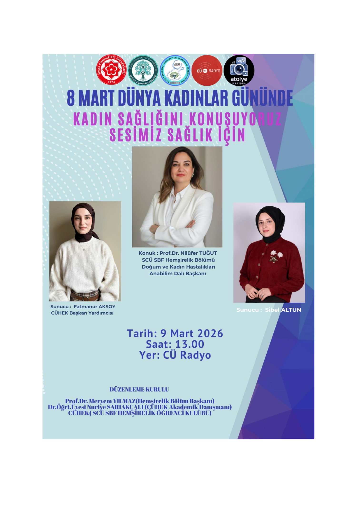 9 Mart 2026 tarihinde saat 13.00’te CÜ Radyo stüdyosunda düzenlenen programın konuğu, Sivas Cumhuriyet Üniversitesi Sağlık Bilimleri Fakültesi Hemşirelik Bölümü Doğum ve Kadın Hastalıkları Hemşireliği Anabilim Dalı Başkanı Prof. Dr. Nilüfer TUĞUT oldu. Programda kadın sağlığının önemi, kadınların yaşam döngüsü boyunca karşılaşabileceği sağlık sorunları, koruyucu sağlık hizmetleri ve kadın sağlığının geliştirilmesinde sağlık profesyonellerinin rolü ele alındı.