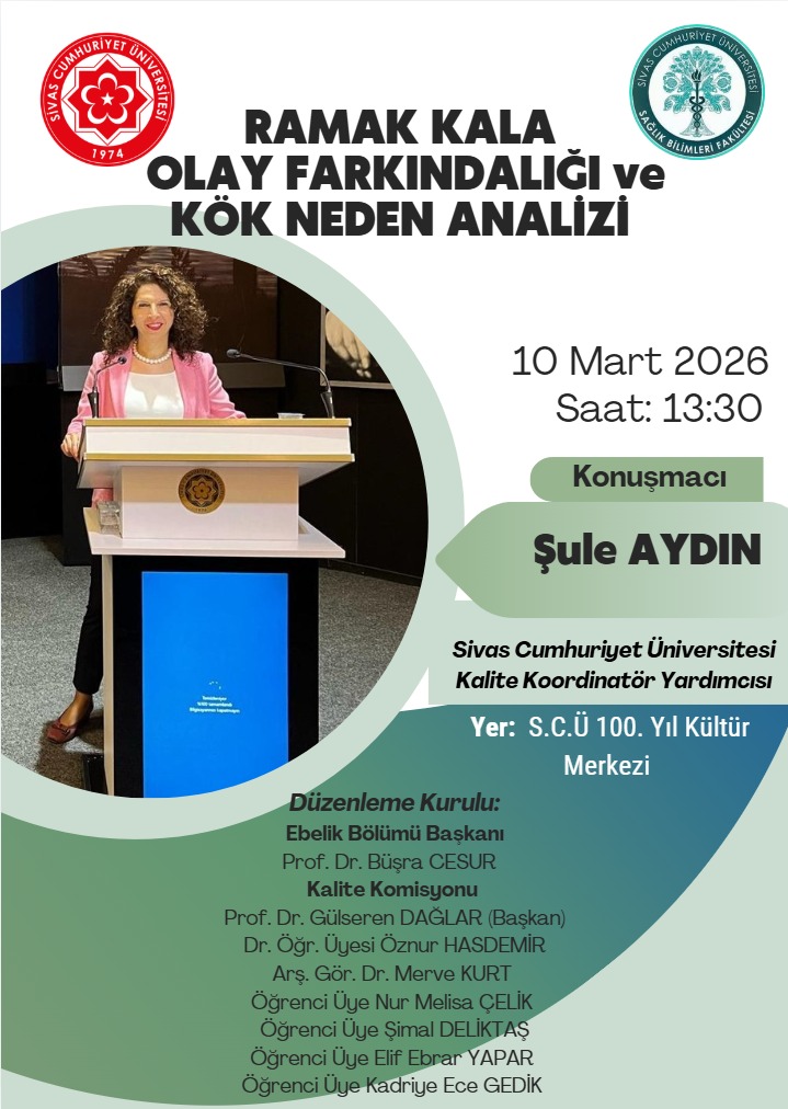 Sivas Cumhuriyet Üniversitesi Sağlık Bilimleri Fakültesi Ebelik Bölüm Başkanlığı ile Ebelik Bölümü Kalite Komisyonu tarafından düzenlenen “Ramak Kala Olay Farkındalığı ve Kök Neden Analizi” konulu konferans, 10 Mart 2026 tarihinde 100. Yıl Kültür Merkezi’nde gerçekleştirildi. Etkinliğe Sağlık Bilimleri Fakültesi Dekanı Prof. Dr. Selma SABANCIOĞULLARI, Suşehri Sağlık Yüksekokulu Müdürü Dr. Öğr. Üyesi ARZUHAN ÇETİNDAĞ, Sağlık Bilimleri Fakültesi Dekan Yardımcıları Prof. Dr. Gülseren DAĞLAR ve Dr. Öğr. Üyesi Nurcan BAĞLAM, Ebelik Bölüm Başkanı Prof. Dr. Büşra CESUR, Hafik Kamer Örnek Meslek Yüksekokulu, Çocuk Bakımı ve Gençlik Hizmetleri Bölümü, Çocuk Gelişimi Bölüm Başkanı Dr. Öğr. Üyesi Özlem NALDÖKEN, öğretim elemanları ve çok sayıda öğrenci katılım sağladı.