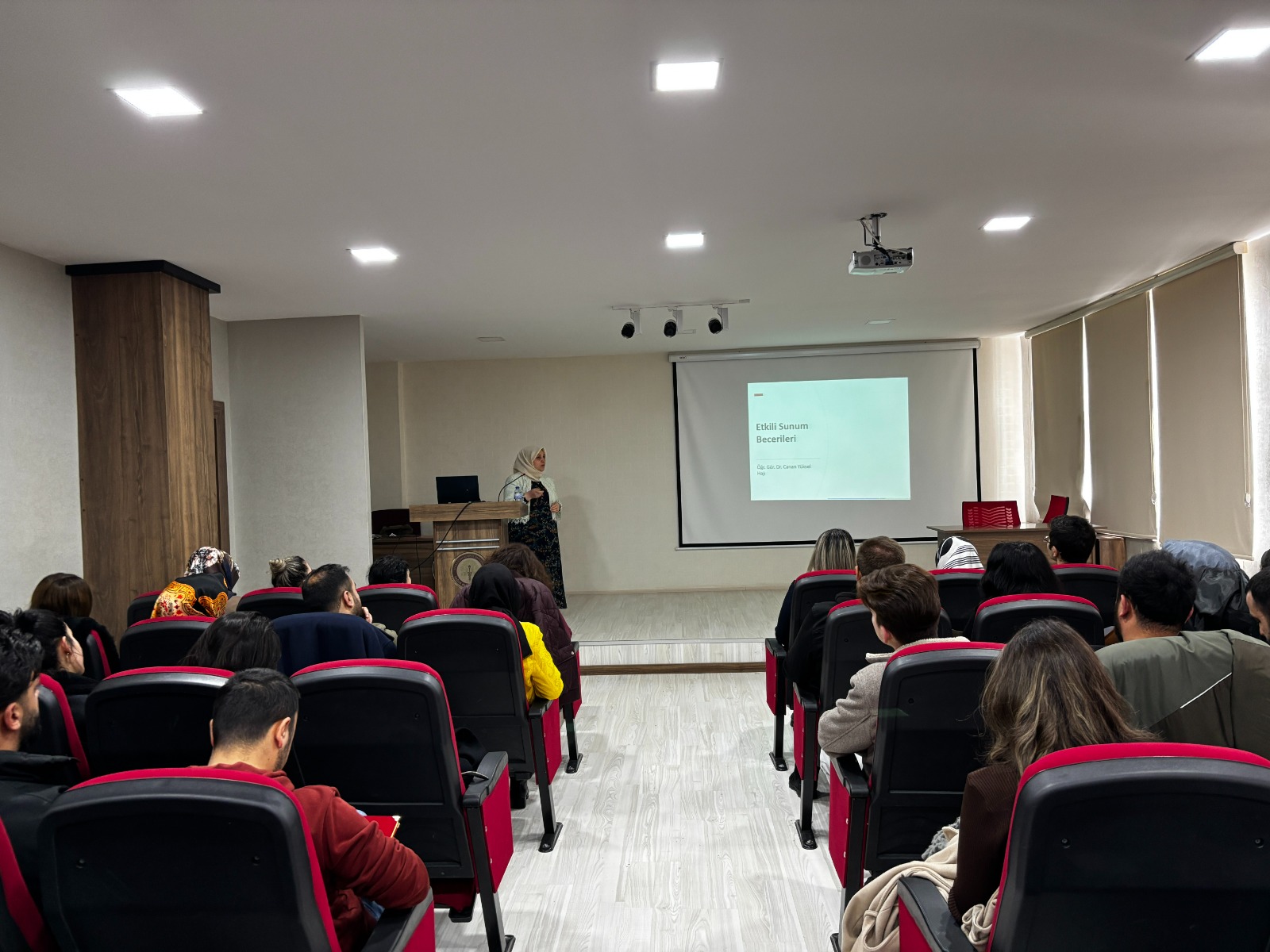 Seminer kapsamında konuşmacı olarak yer alan Öğr. Gör. Dr. Canan Yüksel Haji, etkili bir sunumun nasıl hazırlanması gerektiği, sunumun temel bileşenleri, sunum sürecinde dikkat edilmesi gereken noktalar ve tasarım aşamasında önem taşıyan unsurlar hakkında kapsamlı bilgiler paylaştı. Seminerde, sunumun planlanması, içeriğin düzenlenmesi, görsel tasarımın etkili kullanımı ve dinleyiciyle güçlü iletişim kurulması gibi konular ele alındı. Katılımcılar, etkili sunum hazırlama ve sunma becerilerine ilişkin önemli bilgiler edinme fırsatı buldu.