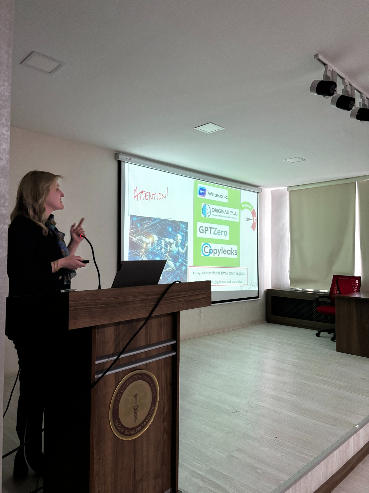 Seminer kapsamında konuşmacı olarak yer alan Prof. Dr. Özden Özel Bektaş, yapay zekânın bilimsel makale yazımında sağladığı kolaylıklar, veri analizi ve literatür taramasındaki katkıları ile birlikte, beraberinde getirdiği etik sorunlar ve sınırlılıkları kapsamlı bir şekilde ele aldı. Katılımcılar, akademik üretimde yapay zekâ kullanımına ilişkin güncel yaklaşımlar hakkında bilgi edinme fırsatı buldu.